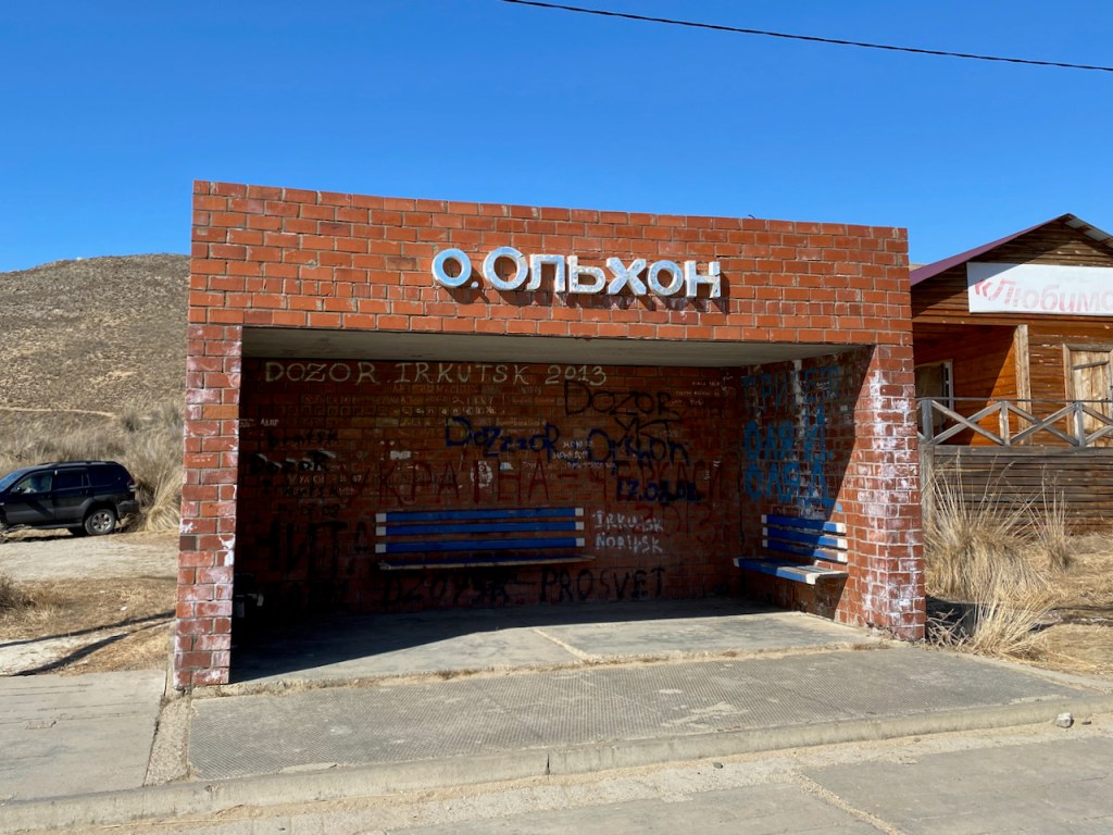 На острове нас встречает автобусная остановка с надписью «Ольхон» и сгоревший дом:
